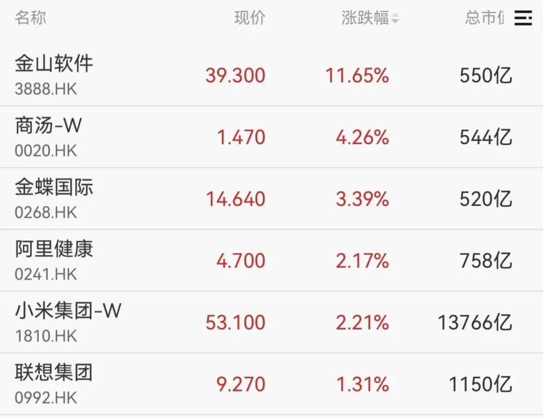 港股低开高走,恒生科技指数率先转涨,金山软件涨超11%,金蝶国际、阿里健康、小米集团等跟涨。