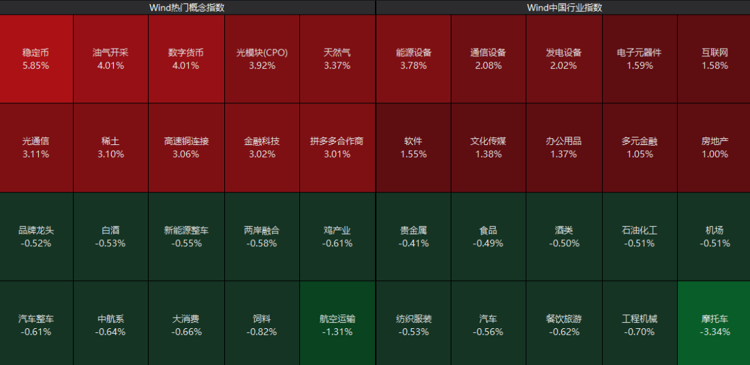 板块上来看,稳定币概念股爆发,油气开采、发电设备、AI应用等板块涨幅居前,而航空运输、餐饮旅游、汽车等板块震荡调整。