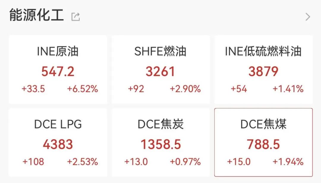 消息面上,以色列袭击伊朗能源设施后,原油期货周一亚洲早盘继续大涨。国内商品期货开盘走高,原油涨超6%,燃油涨近3%,低硫燃料油涨1.41%。