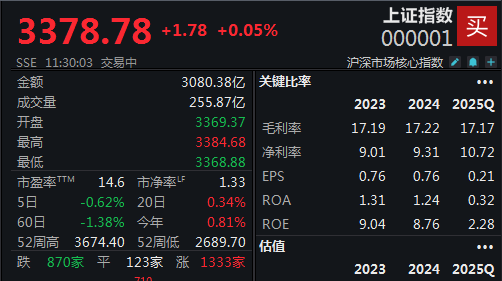 6月16日,A股震荡上涨,截至上午收盘,上证指数涨0.05%报3378.78点,深证成指涨0.13%,创业板指涨0.37%,北证50涨0.86%,科创50跌0.37%,中证A500跌0.01%,A股半日成交8056.63亿元。