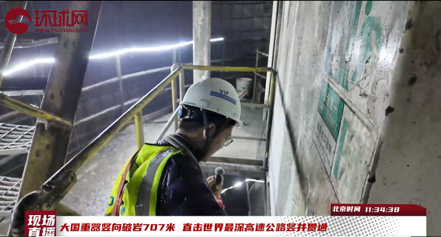 此次直播以《三项世界第一!大国重器竖向破岩707米,直击世界最深高速公路竖井贯通》为主题,由环球网与中国交建联动播出。当天,环球网记者队伍兵分两路,在竖井内部和竖井底部进行接力直播,带领国内外网友云端直击贯通“科幻变现实”的历史性一刻,见证中国基建再攀世界巅峰的壮举。