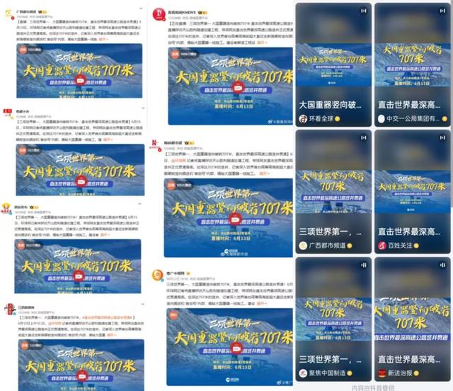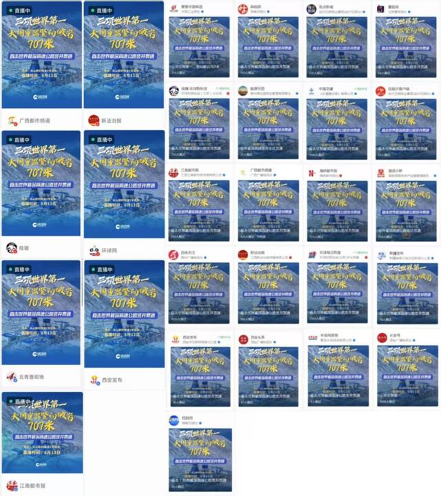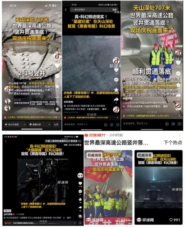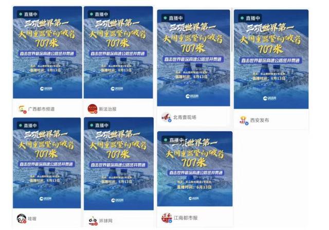 截至6月14日8时,此次直播+短视频在国内观看量超过1800万,其中实时直播全平台在线人数50万+。#基建狂魔把科幻变现实 #中国工程师把美国科幻片变现实 #世界最长高速公路竖井落底贯通 短视频话题斩获6个抖音、快手热搜热榜。在环球网短视频全平台直播以外,还被新疆日报-石榴云、新疆发布、西安发布、北青壹现场、广西都市频道、江南都市报、看看新闻、新法制报、海峡都市报、国资小新、中国交建、中交一公局等53个各级媒体账号、官方账号和央企平台转播,这些平台总粉丝覆盖超3亿。
