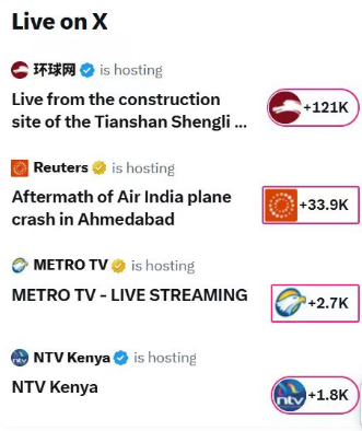 此次直播在海外全平台触及人数近381万,海外实时在线观看人数合计超15万,其中X(原推特)单平台实时在线观看人数超12.1万,居X平台同时段全球媒体直播观看人数首位,力压Reuters(路透社)、Metro TV(印尼都会电视台)、NTV(肯尼亚电视台)。