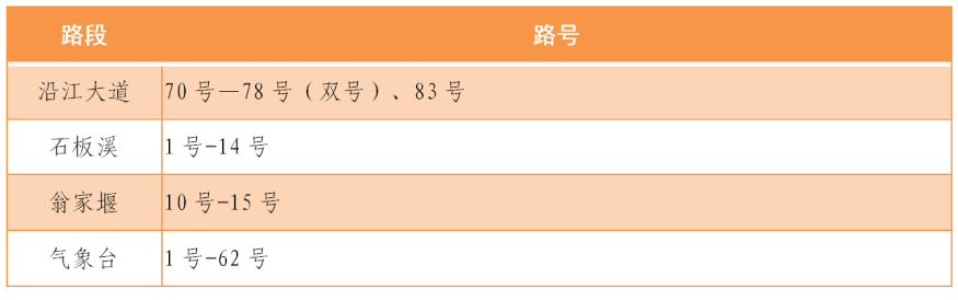 夷陵大道单号353、355、357、401号、夷陵大道双号398、400、402、408、410、416、418、420、422、466号、伍临路单号1—3号、白沙路2、4、6、8号(江天一色)、沿江大道218号(江山多娇)、沿江大道228(中建之星A区)、中建之星B区