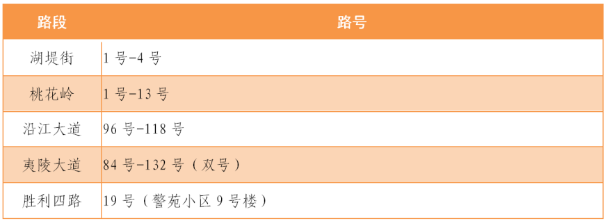胜利三路双号2—10号、胜利二路1—10号、胜利一路1—15号、夷陵大道单号139—223号、夷陵大道双号156—216号、东山大道单号167—283号、东山大道双号166—312号、体育场路45、50号、港窑路3、4、5、7号,河运新村、港务新村、建设新村、汉宜村五、六组、沿江大道131-140、158、159号、金桥月泊