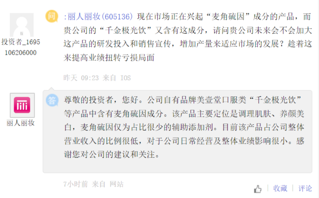 丽人丽妆[605136] :公司自有品牌美壹堂口服类“千金极光饮”等产品中含有麦角硫因成分。该产品主要定位是调理肌肤、养颜美白,麦角硫因仅为占比很少的辅助添加剂。目前该产品占公司整体营业收入的比例很低,对于公司日常经营及整体业绩影响很小。