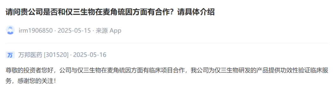 万邦医药[301520] :公司与仅三生物在麦角硫因方面有临床项目合作,我公司为仅三生物研发的产品提供功效性验证临床服务。