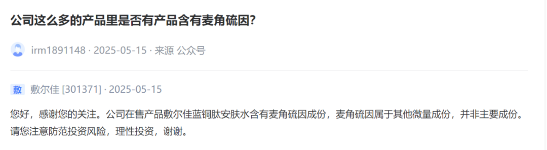 敷尔佳[301371] :公司在售产品敷尔佳蓝铜肽安肤水含有麦角硫因成份,麦角硫因属于其他微量成份,并非主要成份。