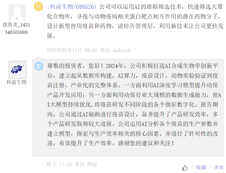 科前生物[688526] :2024年,公司积极打造AI合成生物学创新平台,建立起从数据库构建,AI算力,疫苗设计,动物实验验证到疫苗注册、产业化的完整体系。一方面利用AI深度学习模型提升动保产品开发应用;另一方面利用动保行业大规模的数据生成能力,使AI大模型持续优化,将疫苗研发不同阶段的各个指征数字化。报告期内,公司通过AI辅助进行疫苗设计,显著提升了产品研发效率,多个产品研发取得较大进展。公司运用AI分析各个疫苗的生产参数并建立模型,探索与生产效率相关的核心因素、并进行了针对性的改进,有效提升了生产效率。