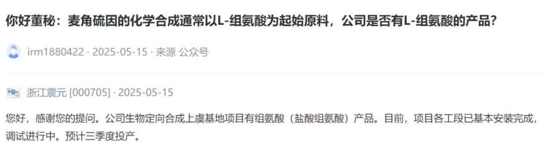 浙江震元[000705] :公司生物定向合成上虞基地项目有组氨酸(盐酸组氨酸)产品。目前,项目各工段已基本安装完成,调试进行中。预计三季度投产。