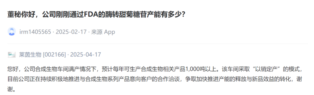 公司刚刚通过FDA的酶转甜菊糖苷产能有多少?