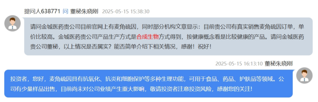 请问金城医药贵公司目前官网上有麦角硫因,同时部分机构文章显示:目前贵公司有真实销售麦角硫因订单,单价比较高。金城医药贵公司产品生产方式是合成生物方式得到,按健康概念看是比较健康的产品。请问金城医药贵公司董秘,以上情况是否属实?能否简单介绍下相关情况?