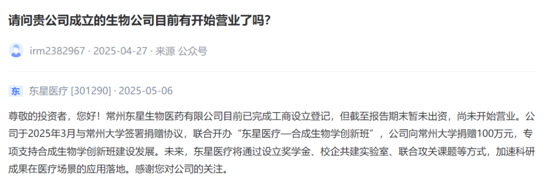 东星医疗[301290] :常州东星生物医药有限公司目前已完成工商设立登记,但截至报告期末暂未出资,尚未开始营业。公司于2025年3月与常州大学签署捐赠协议,联合开办“东星医疗—合成生物学创新班”,公司向常州大学捐赠100万元,专项支持合成生物学创新班建设发展。未来,东星医疗将通过设立奖学金、校企共建实验室、联合攻关课题等方式,加速科研成果在医疗场景的应用落地。