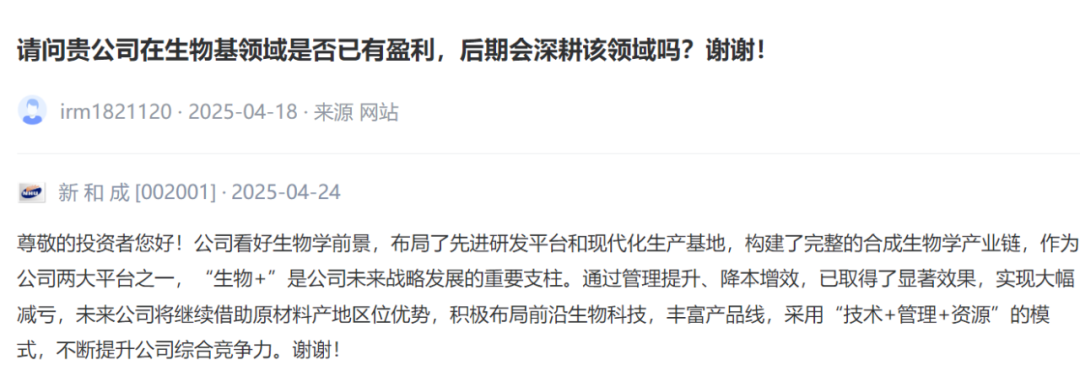 请问贵公司在生物基领域是否已有盈利,后期会深耕该领域吗?