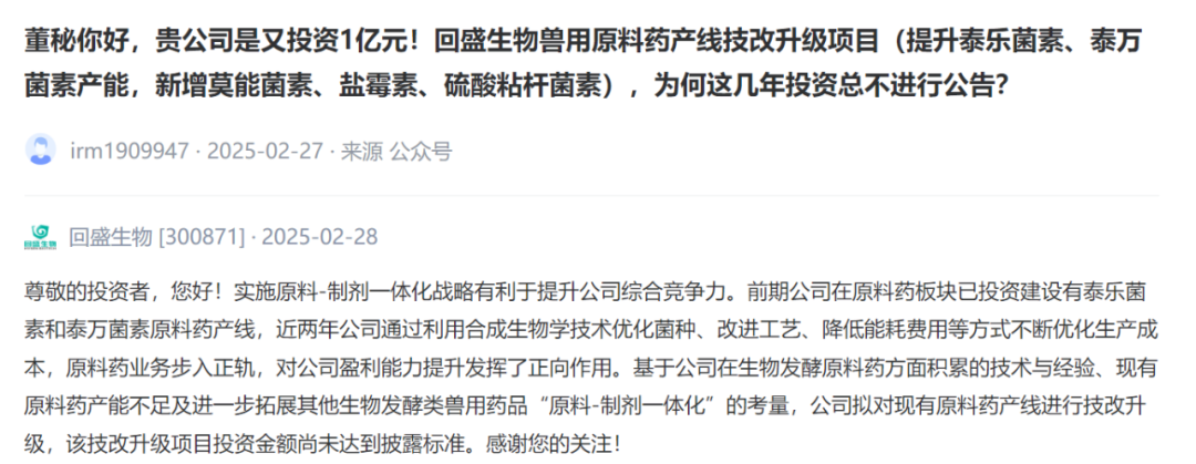回盛生物兽用原料药产线技改升级项目(提升泰乐菌素、泰万菌素产能,新增莫能菌素、盐霉素、硫酸粘杆菌素),为何这几年投资总不进行公告?