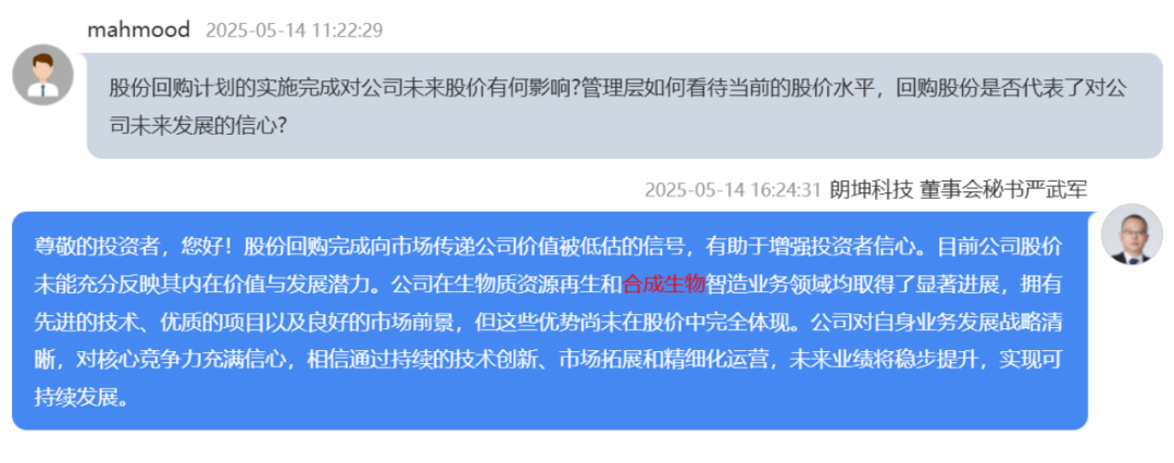 朗坤科技[301305] :股份回购完成向市场传递公司价值被低估的信号,有助于增强投资者信心。目前公司股价未能充分反映其内在价值与发展潜力。公司在生物质资源再生和合成生物智造业务领域均取得了显著进展,拥有先进的技术、优质的项目以及良好的市场前景,但这些优势尚未在股价中完全体现。公司对自身业务发展战略清晰,对核心竞争力充满信心,相信通过持续的技术创新、市场拓展和精细化运营,未来业绩将稳步提升,实现可持续发展。(来源:朗坤科技2024年度业绩说明会)