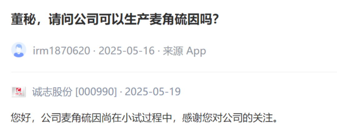 近日,投资者纷纷前往互动平台询问有关企业关于麦角硫因、合成生物的生产销售情况,全景为您精选来自上市公司最真实的声音。(以下内容均摘自深交所互动易、上证e互动、上市公司公告、业绩说明会等)