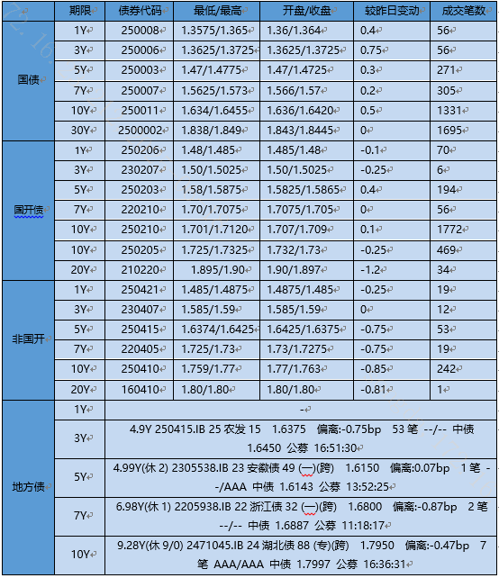 今今日同业存单尚可,长端收益率下行。一级发行需求不错,9M和1Y大行发在1.63%-1.64%和1.63%。一级发行带动二级收益率下行。全日分期看国股存单,6月到期1.50;9月底到期1.605;12月底到期1.62;3月底到期1.64;6月到期1.64。