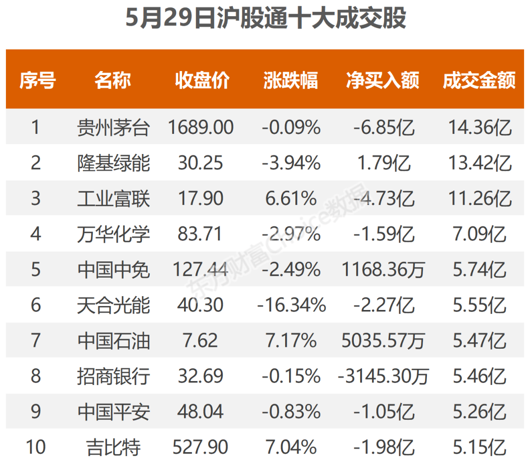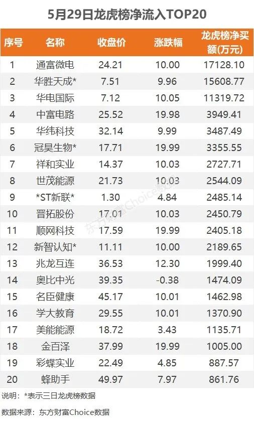 5月29日,陆股通参与龙虎榜中个股共涉及17股。其中7股被陆股通净买入,通富微电被买入最多,净买入2.36亿元,华电国际也被净买入0.62亿元;另外10股被陆股通净卖出,工业富联被卖出最多,三日净卖出4.83亿元。