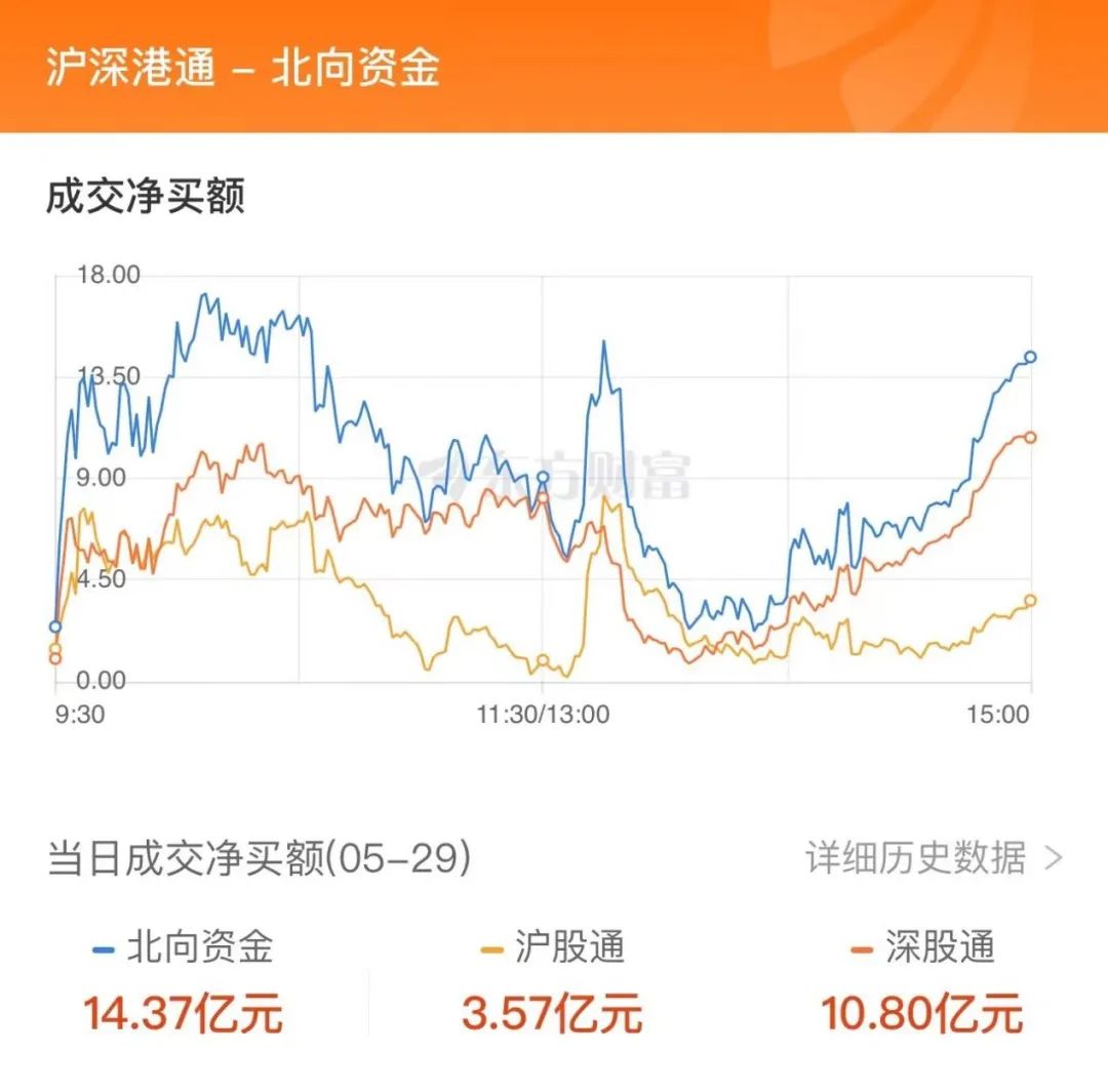 北向资金当日净流入14.37亿元,其中沪股通净流入3.57亿元,深股通净流入10.8亿元。北向资金当日成交金额1159.45亿元,占A股总成交额的12.59%。