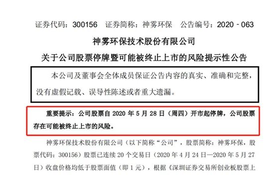 5月27日晚间,神雾环保发布公告,公司股票自 2020年 5 月 28 日(周四)开市起停牌,存在可能被终止上市的风险。