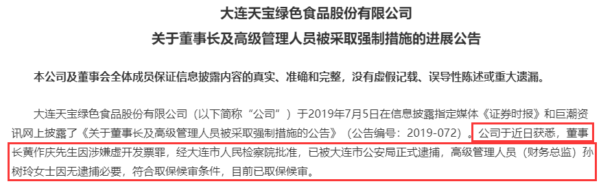 2019年7月29日晚,ST天宝公告,公司董事长黄作庆因涉嫌虚开发票罪,经大连市人民检察院批准,已被大连市公安局正式逮捕。高级管理人员(财务总监)孙树玲因无逮捕必要,符合取保候审条件,目前已取保候审。