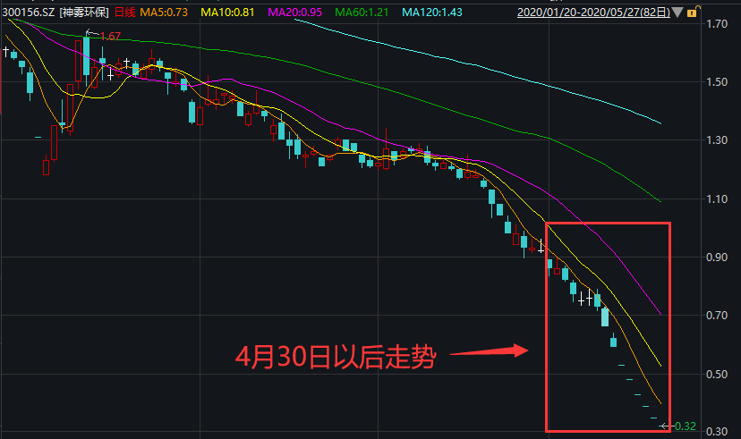 神雾环保不是ST股,日涨跌幅为10%,早在一周前神雾环保的命运就已经明牌,在第15个股价低于1元的交易日时,股价收盘报0.53元/股,此后5个交易日即便涨停都无法扭转颓势,此后神雾环保加速下跌,连封5个跌停板。