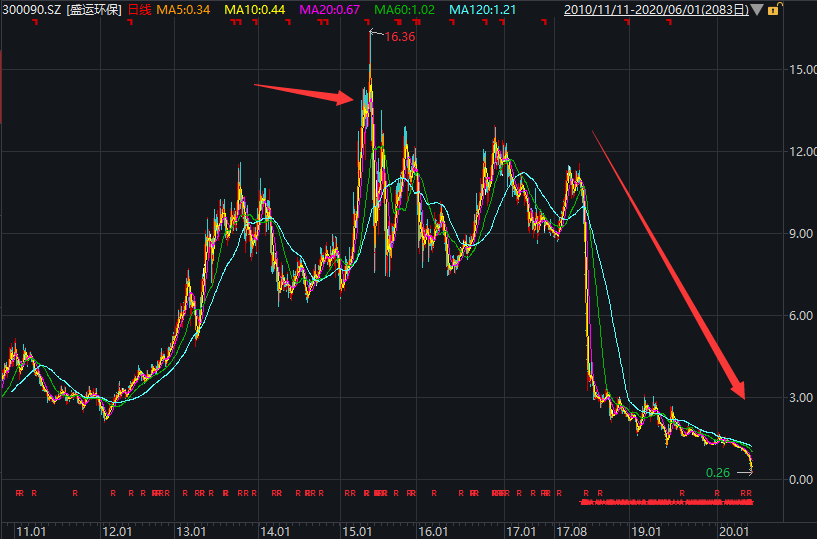 盛运环保从2015年6月16.41元股价(前复权)高位下来,到今日跌至0.32元,盛运环保股价暴跌了98%;总市值也从高位时174.58亿元,跌至今日收盘的4.22亿元,缩水170亿。