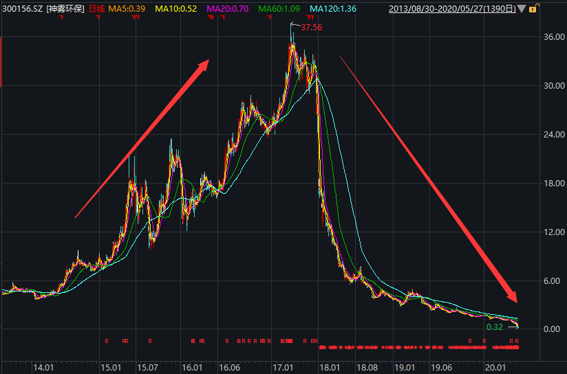2017年,神雾的造假事件爆发,让这只市值一度380亿的环保断崖式下跌。截至今天市值仅剩3.23亿。