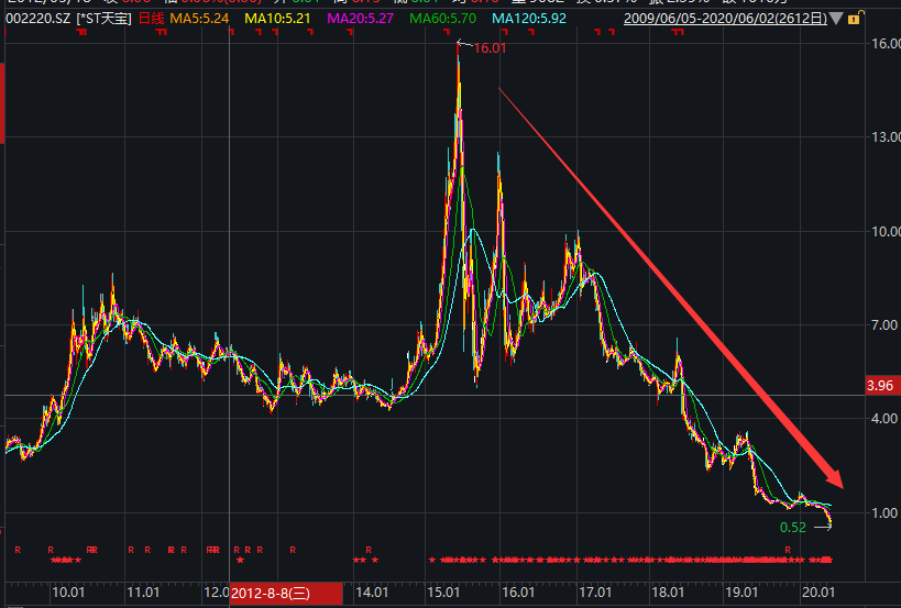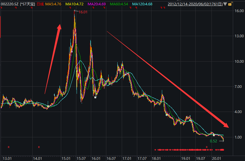 截至到停牌前,*ST天宝报收0.52元,据其高光时刻,股价已经跌去97%。