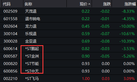 截至今日收盘还有*ST金洲、*ST节能、*ST鹏起、*ST中天等4只个股股价低于1元面值,也走在了面值退市边缘,岌岌可危。