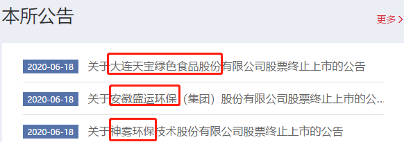 6月18日晚间,根据深交所官网发布的消息显示,由于连续20个交易日股价低于1元,神雾环保、盛运环保、天宝股份三家公司被终止上市。
