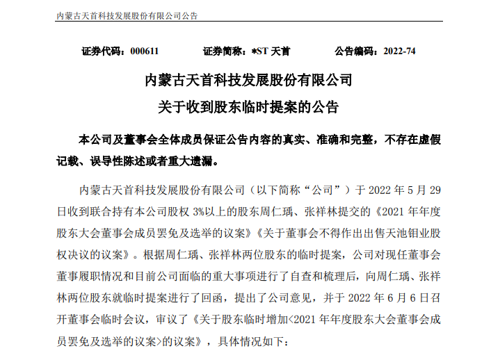*ST天首公告,公司于5月29日收到联合持有本公司股权3%以上的股东周仁瑀、张祥林提交的《2021年年度股东大会董事会成员罢免及选举的议案》《关于董事会不得作出出售天池钼业股权决议的议案》。