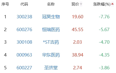 冠昊生物、恒瑞医药、*ST吉药、华东医药、圣济堂位列涨幅榜后五位,涨幅分别为-7.76%、-5.67%、-4.70%、-4.35%、-3.86%。