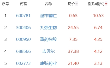其中,退市辅仁、九强生物、重药控股、吉贝尔、康弘药业位列板块涨幅前五位,涨幅分别为10.53%、6.74%、4.25%、4.12%、3.13%。