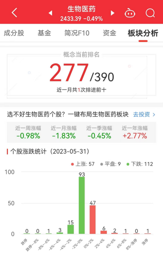 中国经济网北京5月31日讯 今日,生物医药板块整体涨幅-0.49%,其中57只股票上涨,9只股票平盘,112只股票下跌。