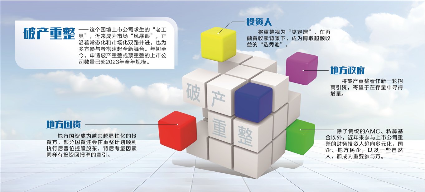 逐渐变大的市场为多方参与者搭建起全新舞台,一些新玩法正在顺势产生。例如,有些投资人将重整视为“类定增”,在再融资收紧背景下,成为博取超额收益的“选秀池”;有些地方政府则将其看作新一轮招商引资,寄望于在存量中寻得增量。这些新玩法既随着市场环境的变化而生,也随着新“国九条”的落地而变。