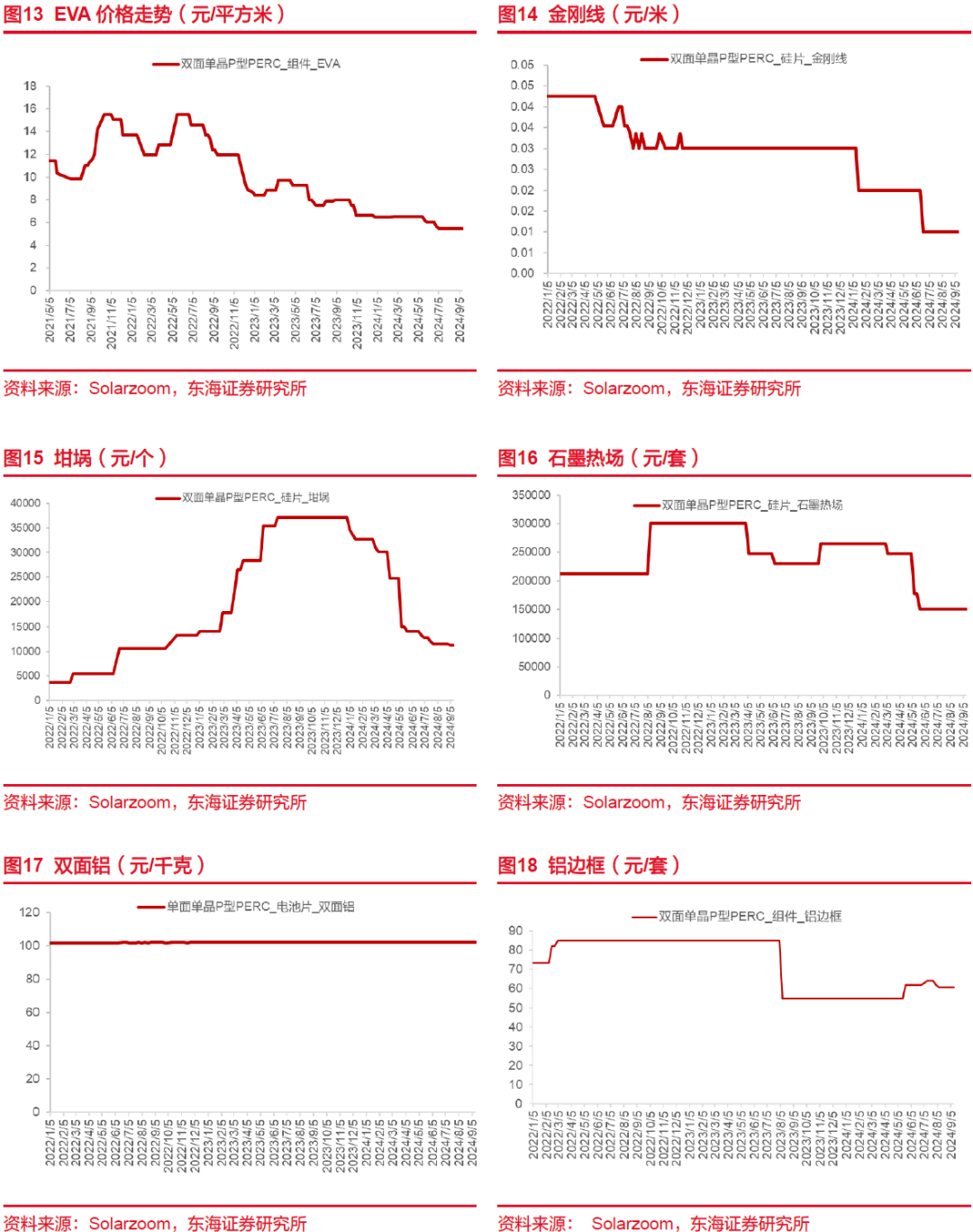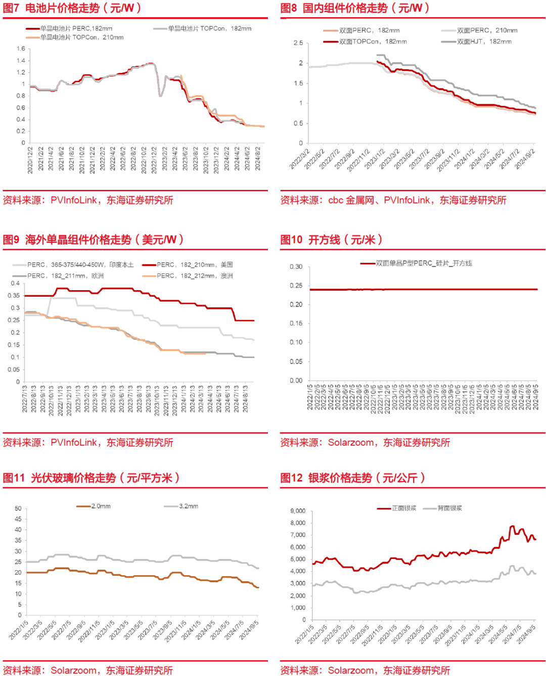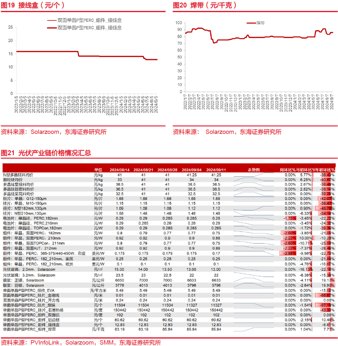 4)组件:价格下降。由于四季度订单能见度不明朗,国内年末抢装采购高峰未现,库存压力加大,近期部分厂家策略转趋激进。组件价格再次走跌,头部企业价格略有松动,新单价格接近0.7元/W,部分新单谈价来到0.65元/W,组件价格修复回升较有难度。因少数一体化厂家谨慎下调排产,整体9月组件排产环比增幅0.7%。