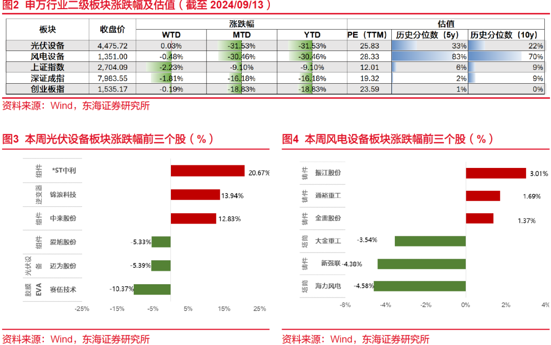 本周(09/09-09/13)申万光伏设备板块上涨0.03%,跑赢沪深300指数2.27个百分点,申万风电设备板块上涨-0.48%,跑赢沪深300指数1.75个百分点。本周光伏板块涨幅前三个股为ST中利、锦浪科技、中来股份,跌幅前三个股为赛伍技术、迈为股份、爱旭股份。本周风电板块涨幅前三个股为振江股份、通裕重工、金雷股份,跌幅前三个股为海力风电、新强联、大金重工。