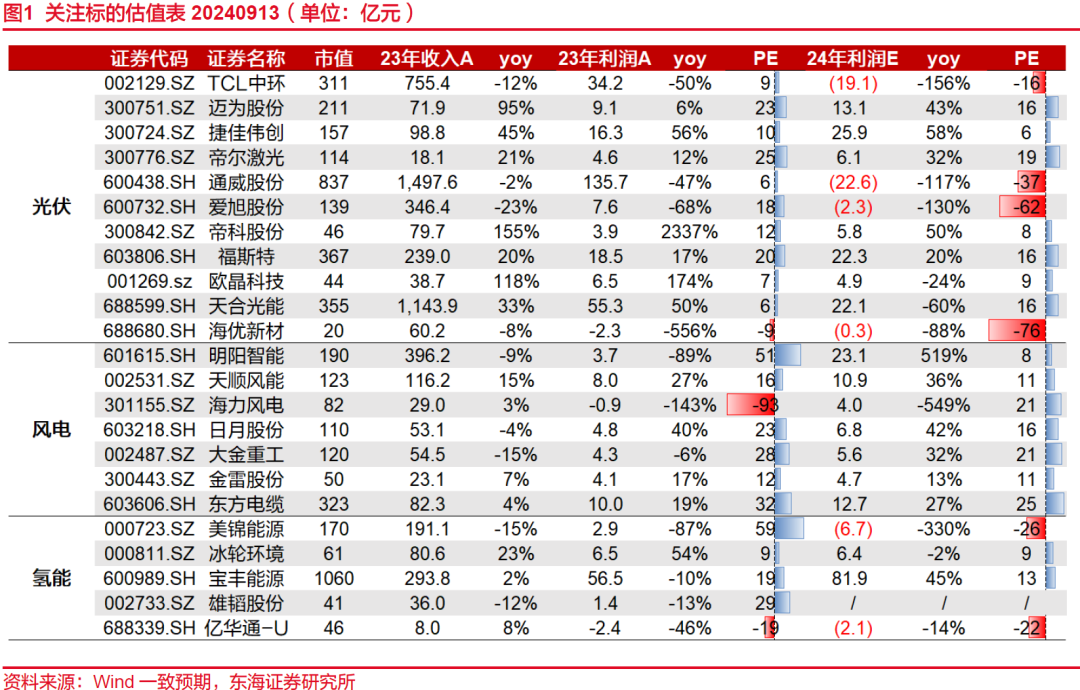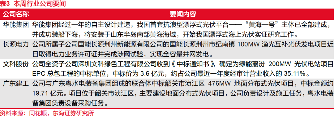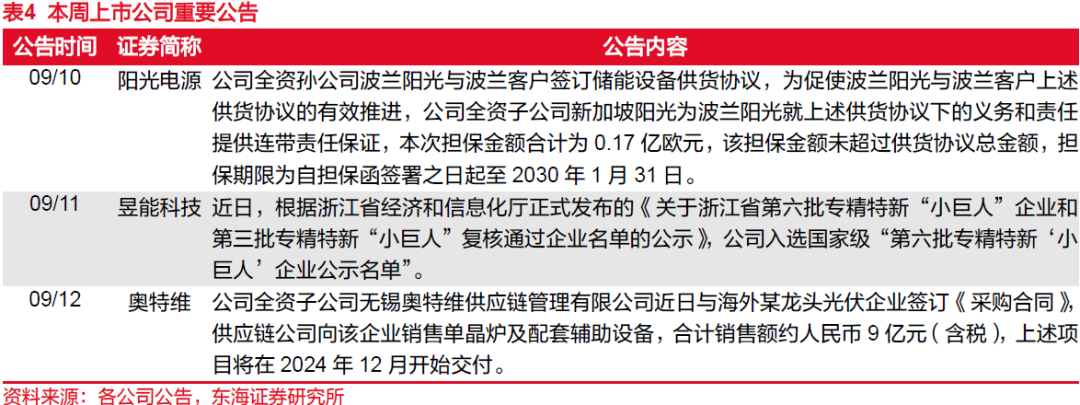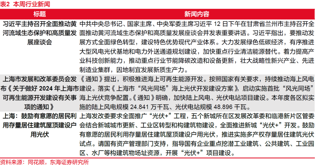 海风方面,本周共有三个海风项目合计1004MW开标,包含两个EPC项目。含塔筒中标价格约3030元/kW,虽然较7~8月开标价格略有回调,但高于6月的价格,整体中标价格维持窄幅震荡。本周阳江帆石一海上风电项目启动首回500kV海缆及敷设招标,广东省自然资源局公示阳江帆石二项目用海前公示,江苏国信大丰项目公示35kV海缆供货及施工中标候选人。前期广东省、江苏省海风受限制性因素影响,市场情绪低迷,普遍呈观望态势,近期粤、苏两省启动海缆采购招标表示限制性因素影响已然减弱,国内海风建设有望提速,布局粤苏两省的海缆企业或将率先受益。海外海风发展势头强劲,国内海工产品在具备海外项目成功交付经验的基础上,出口机遇或将持续走强。国内外海风需求共振背景下,海风板块整体有望迎来密集催化,我们认为零部件厂商业绩在今年下半年仍具备一定的弹性空间。