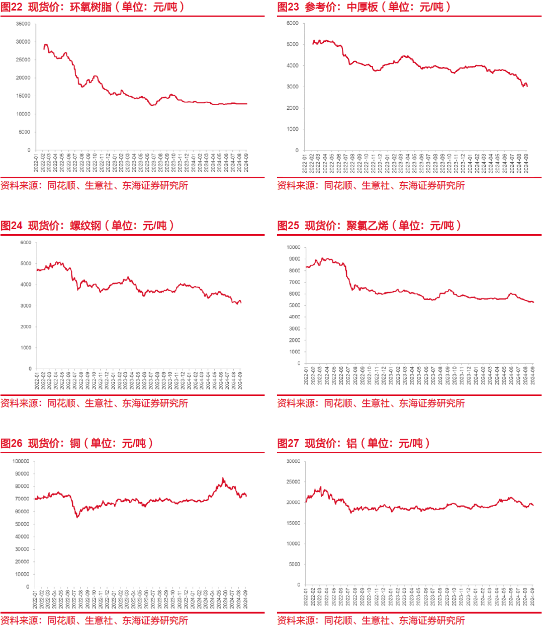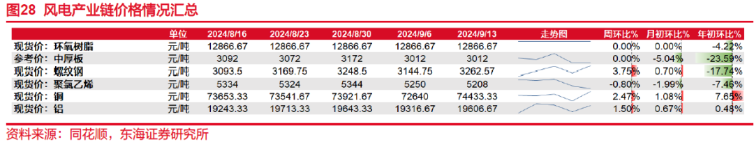 截至9月13日,环氧树脂、中厚板、螺纹钢报价分别为12866.67元/吨、3012元/吨、3262.57元/吨,周环比分别为0.00%、0.00%、3.75%,较年初环比分别为-4.22%、-23.59%、-17.74%。上游大宗商品价格在2024年初小幅下行后,维持窄幅震荡。