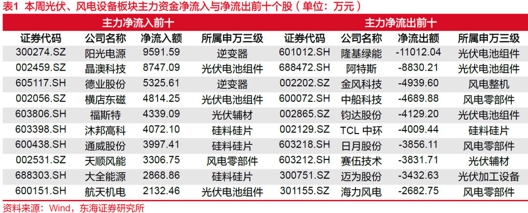 本周光伏、风电板块主力净流入前五的个股为阳光电源、晶澳科技、德业股份、横店东磁、福斯特,主力净流出前五为隆基绿能、阿特斯、金风科技、中船科技、钧达股份。
