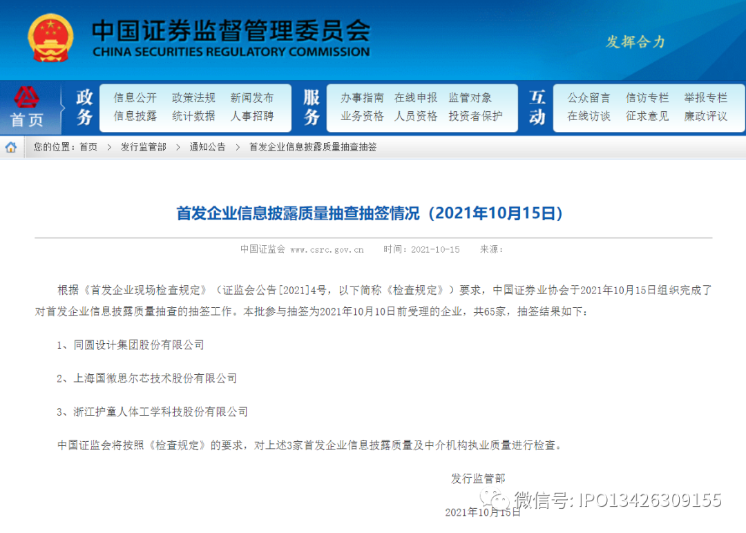 按照《首发企业现场检查规定》,随机抽取的企业名单范围由中国证监会汇总提供的所有未经上市委会议审议或未经发审会审核且未参与过随机抽取的首发企业构成。本批参与抽取企业共65家,其中科创板13家、创业板23家、主板29家,按照5%的比例随机抽取了3家。随机抽取结果为:同圆设计集团股份有限公司、上海国微思尔芯技术股份有限公司、浙江护童人体工学科技股份有限公司。