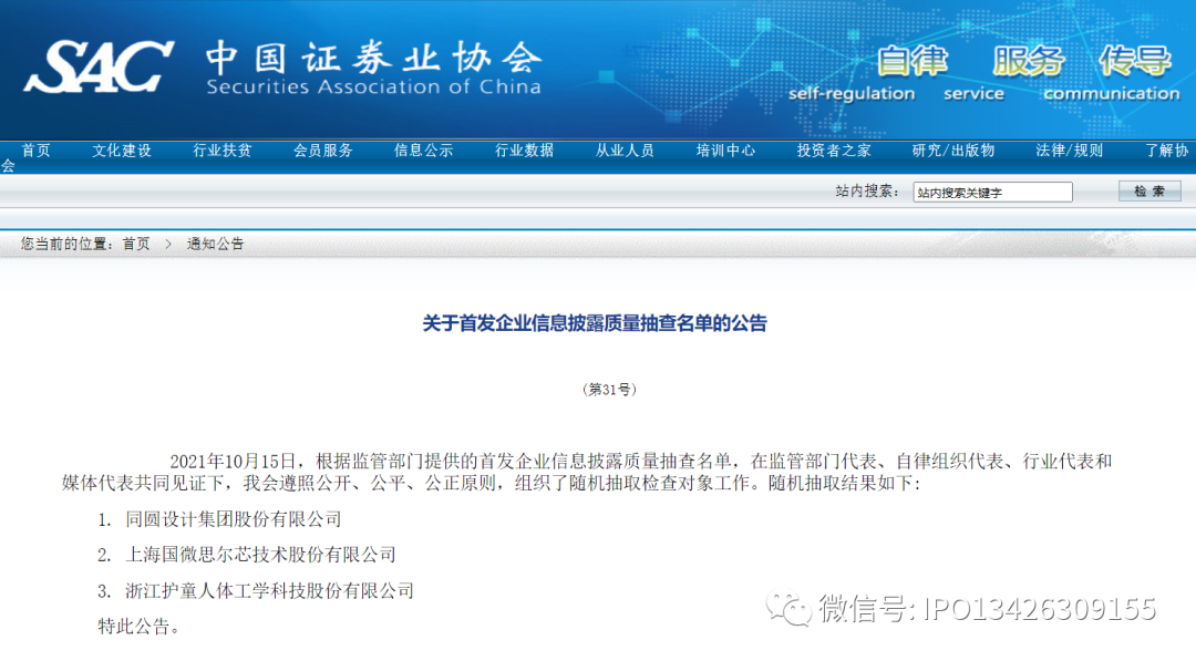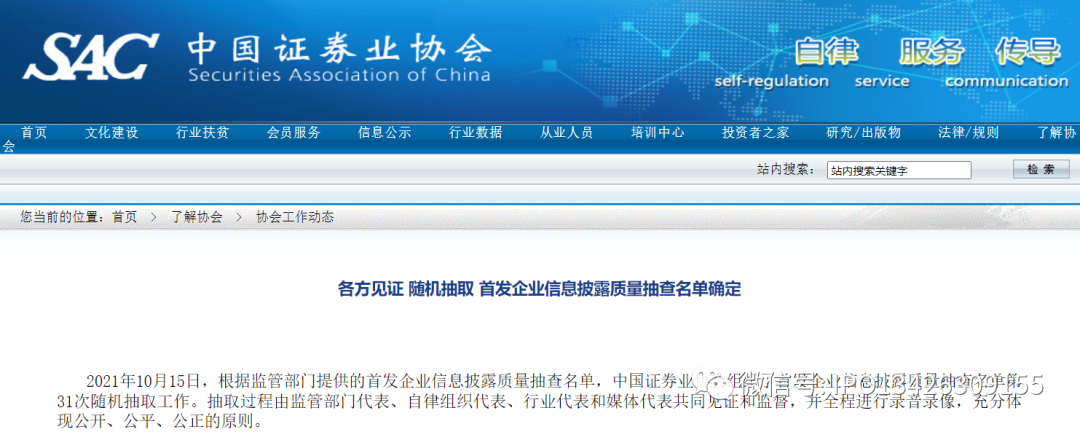 2021年10月15日,根据监管部门提供的首发企业信息披露质量抽查名单,中国证券业协会组织了首发企业信息披露质量抽查名单第31次随机抽取工作。抽取过程由监管部门代表、自律组织代表、行业代表和媒体代表共同见证和监督,并全程进行录音录像,充分体现公开、公平、公正的原则。