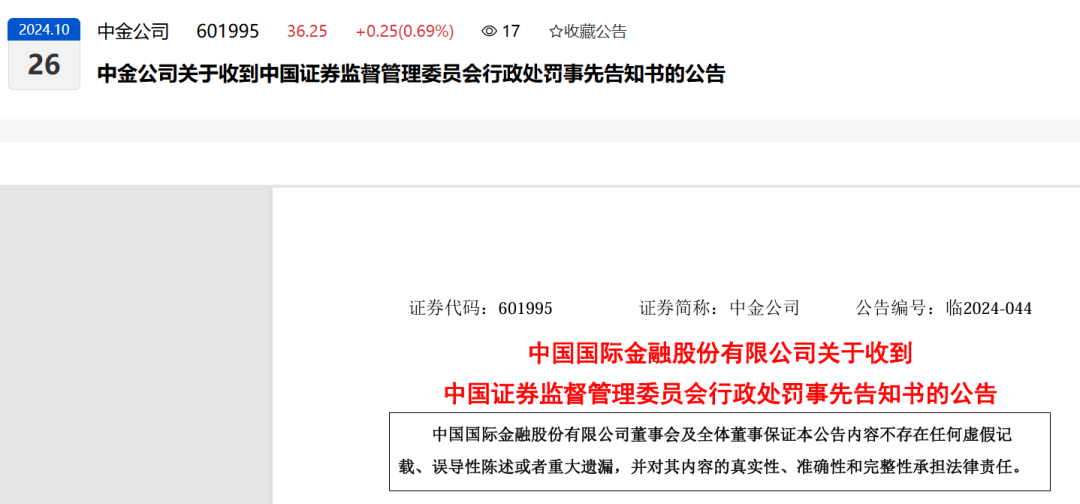 2024年10月26日,中金公司发布公告,针对此前因涉嫌在上海思尔芯技术股份有限公司IPO保荐业务中未尽到勤勉尽责而被证监会立案调查的事项,公司表示已收到证监会的《行政处罚事先告知书》。根据告知书内容,证监会计划责令公司进行整改,发出警告,并处以800万元的罚款。此外,对于该项目直接负责的两名主管人员,将分别被处以150万元的罚款。