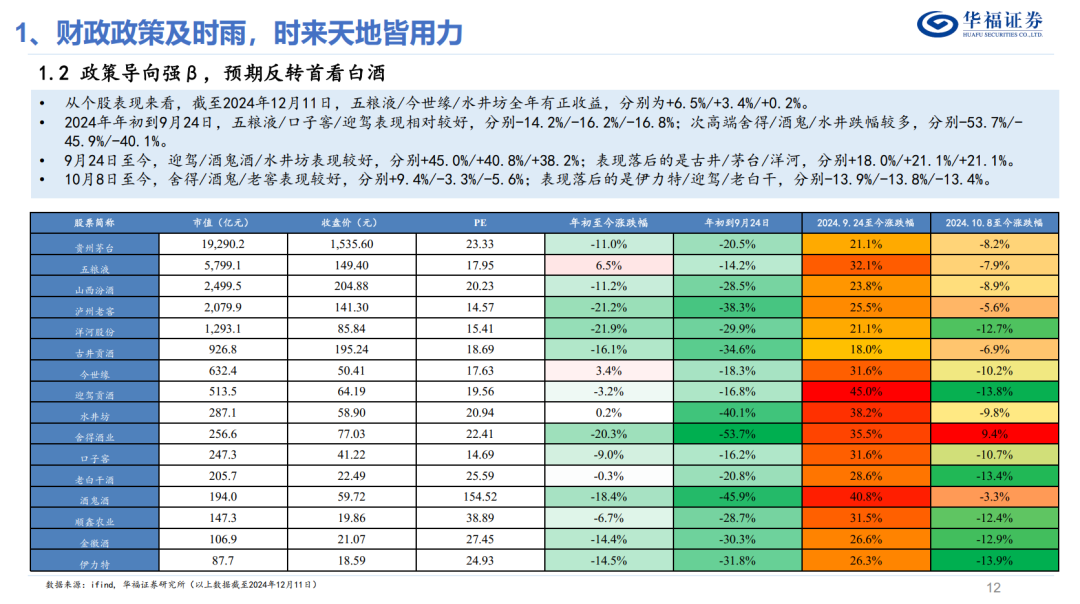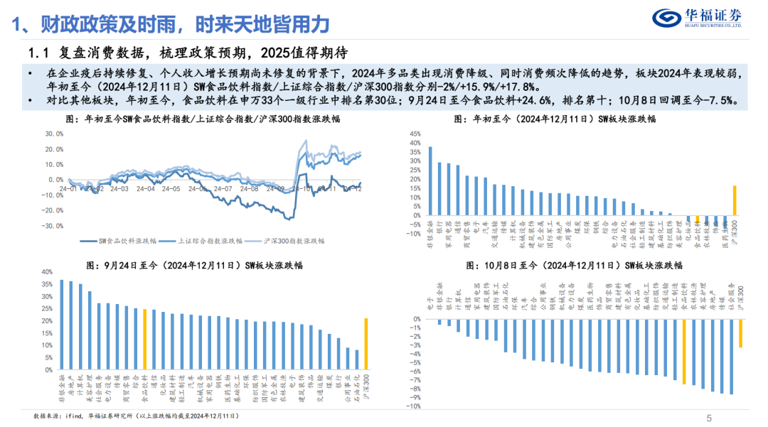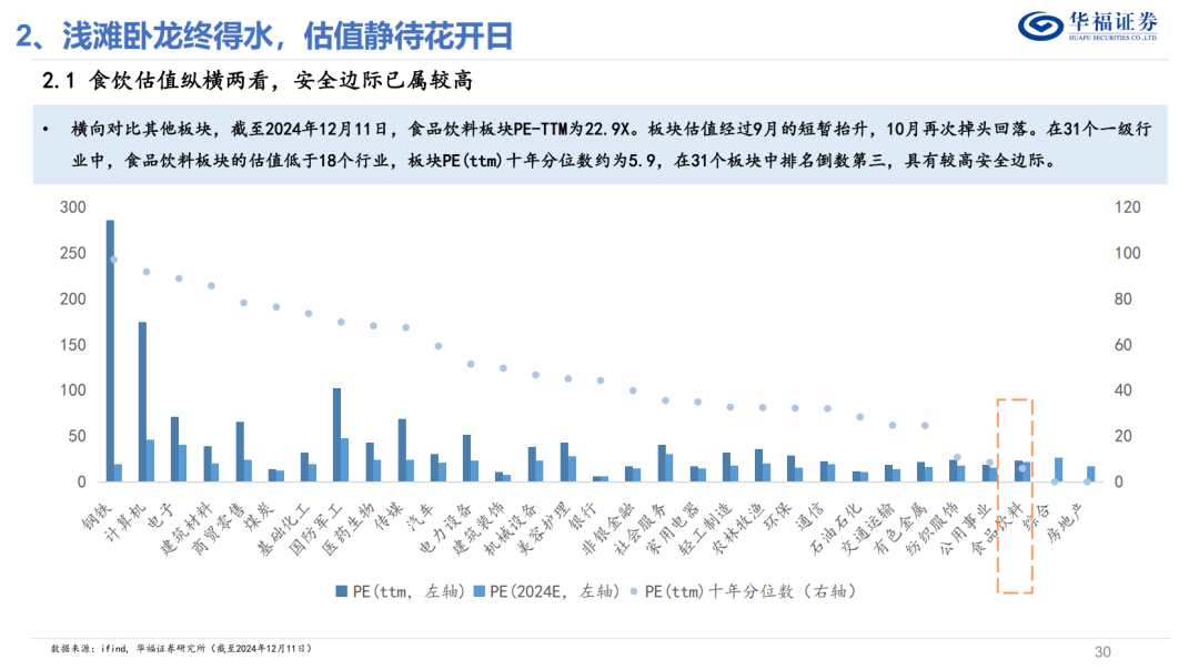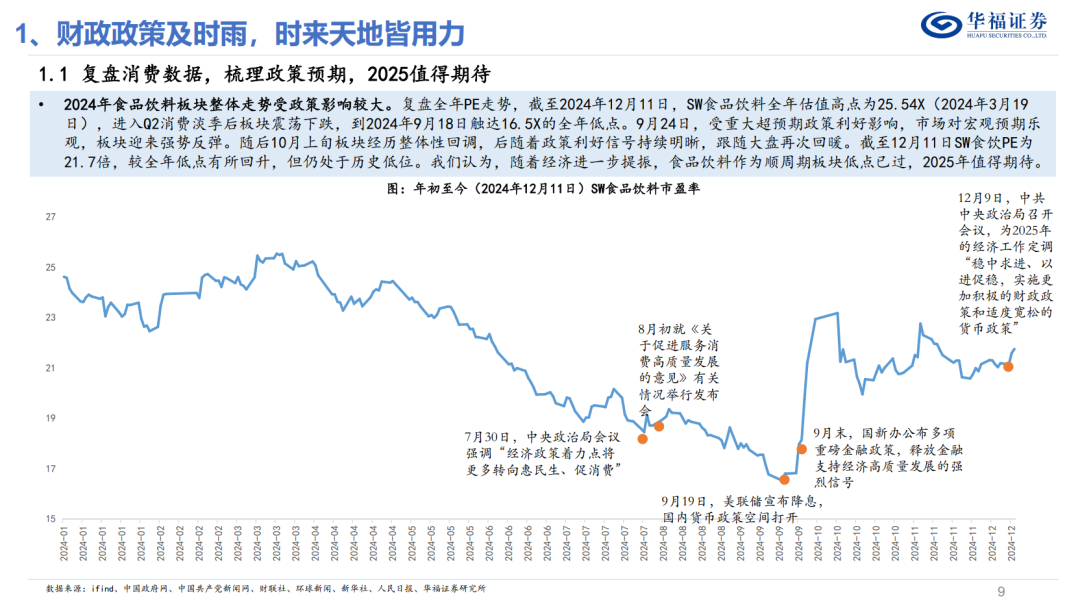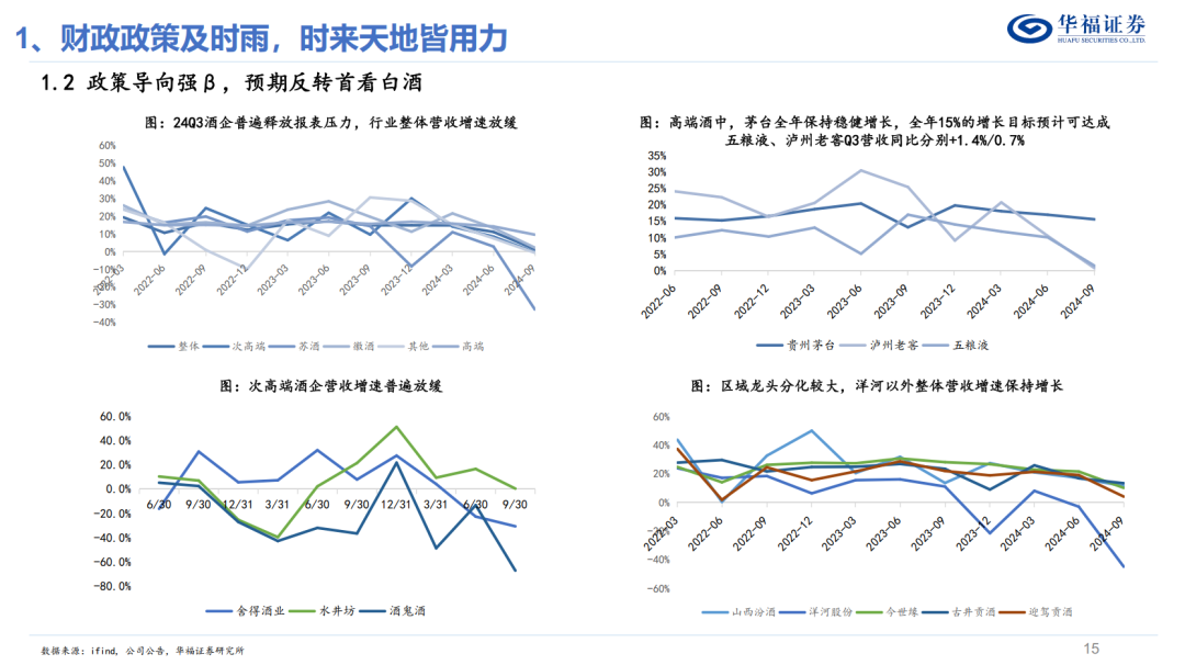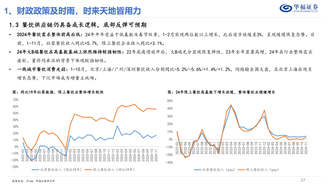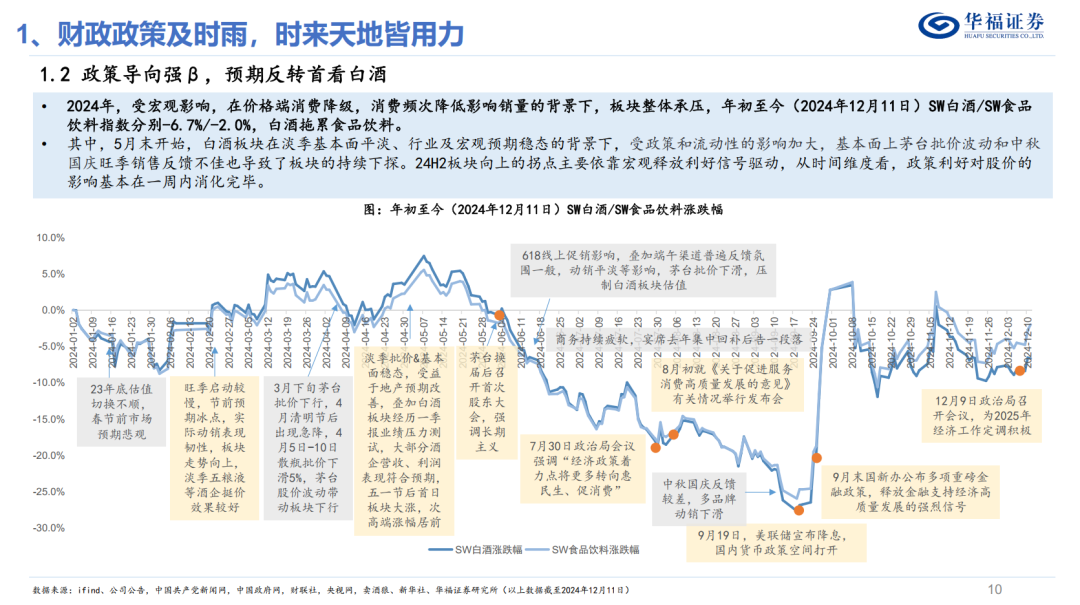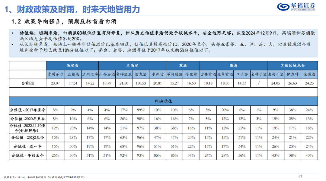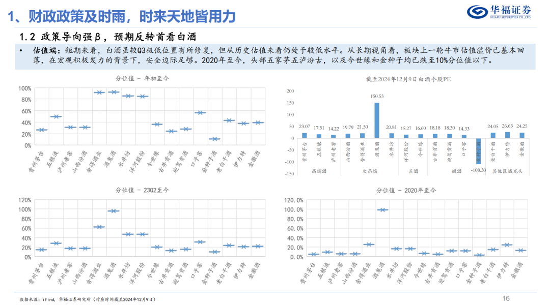 食饮中部分板块与宏观经济强相关,如白酒、餐饮及餐饮产业链上游,故今年Q1-3在市场对宏观信心走弱的背景下,该两板块出现长时间的估值回调,期间对未来的预期也落入较低区间,而我们认为随着后续相关财政政策的及时落地,两板块将率先开始估值修复,“财政政策及时雨,时来天地皆用力”,白酒及餐饮产业链具备配置价值。