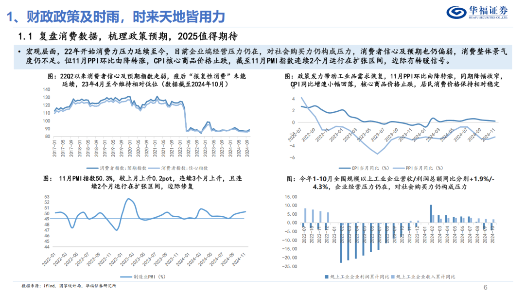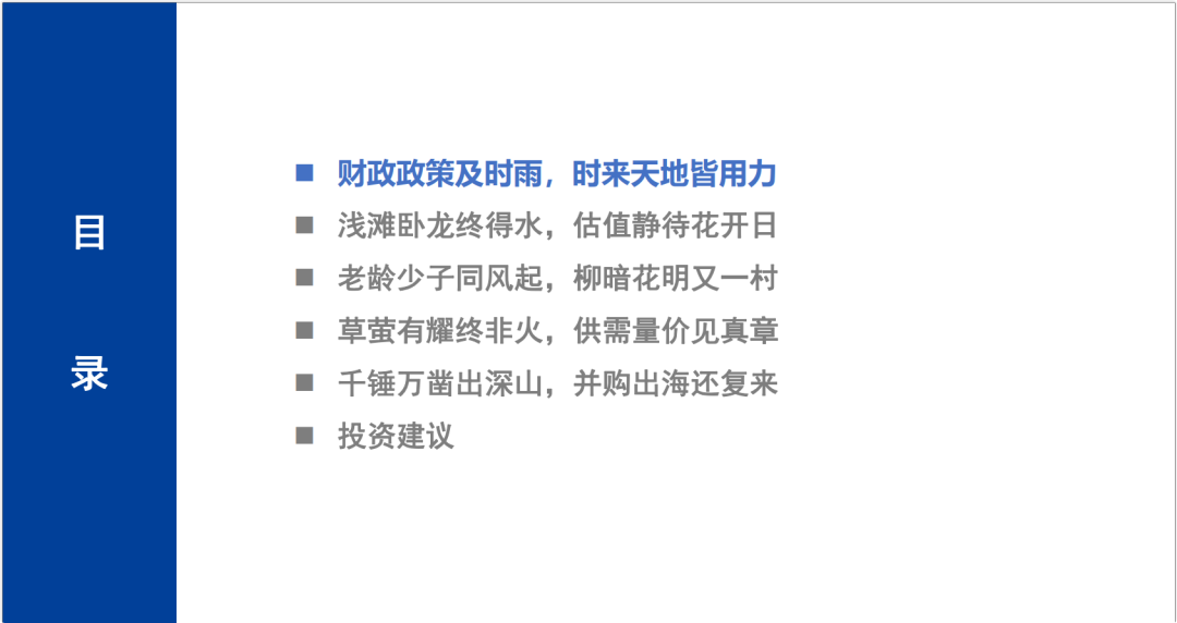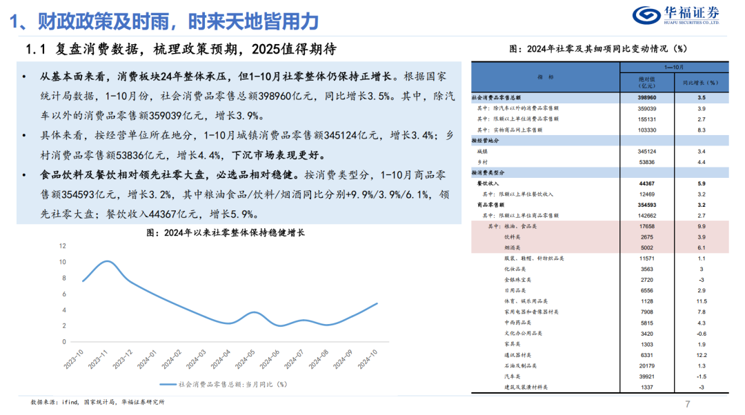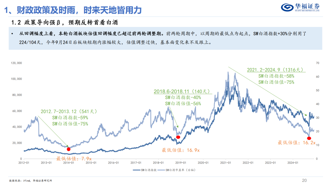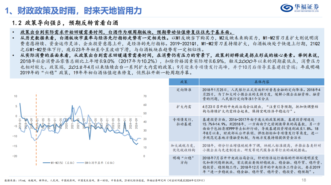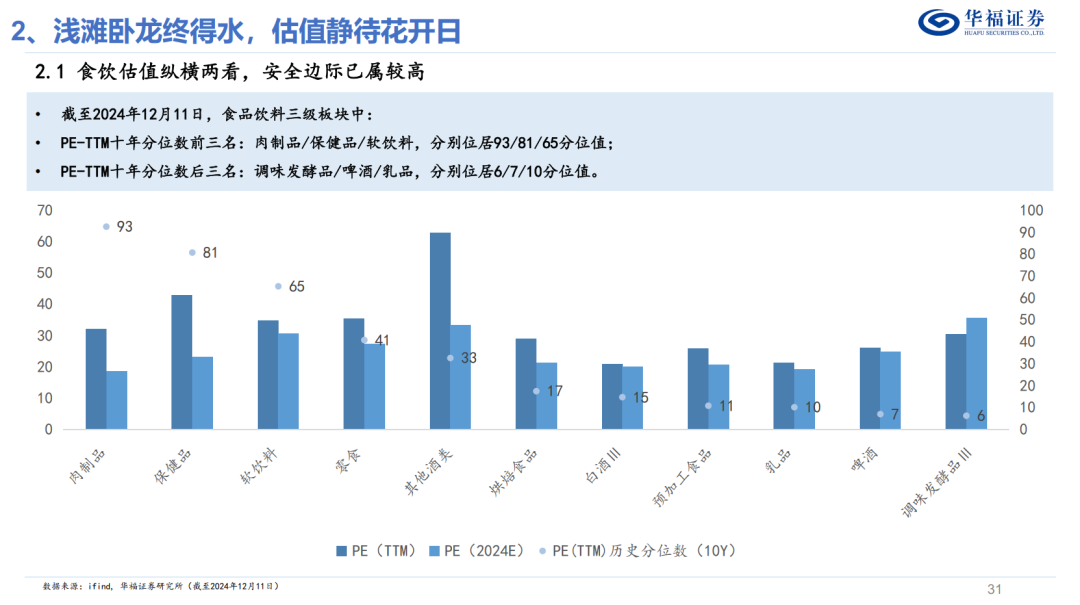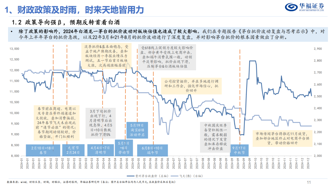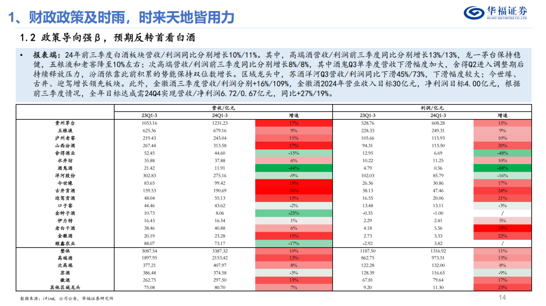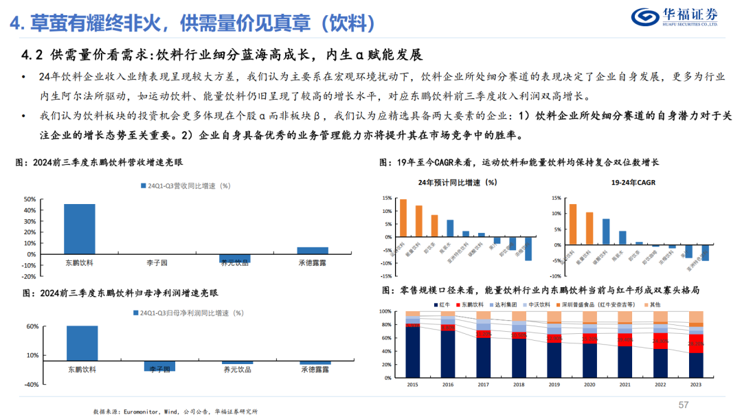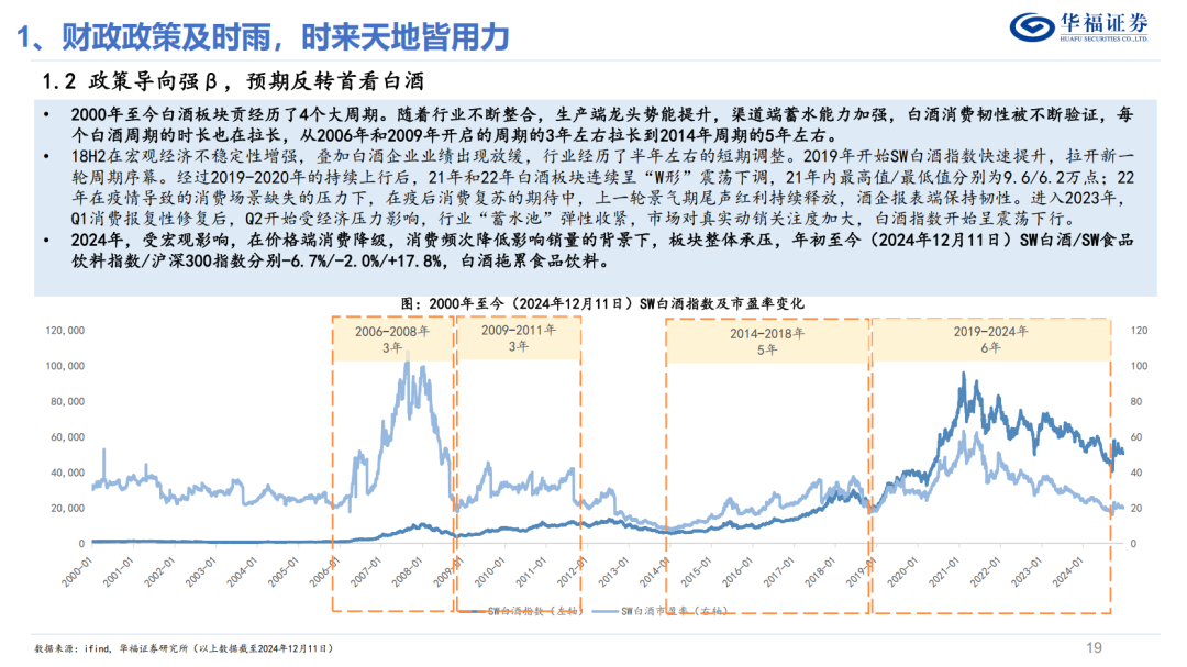 食饮中部分板块与宏观经济强相关,如白酒、餐饮及餐饮产业链上游,故今年Q1-3在市场对宏观信心走弱的背景下,该两板块出现长时间的估值回调,期间对未来的预期也落入较低区间,而我们认为随着后续相关财政政策的及时落地,两板块将率先开始估值修复,“财政政策及时雨,时来天地皆用力”,白酒及餐饮产业链具备配置价值。