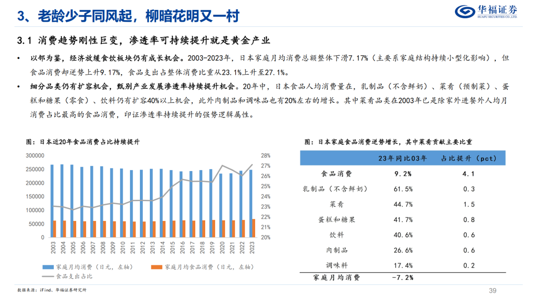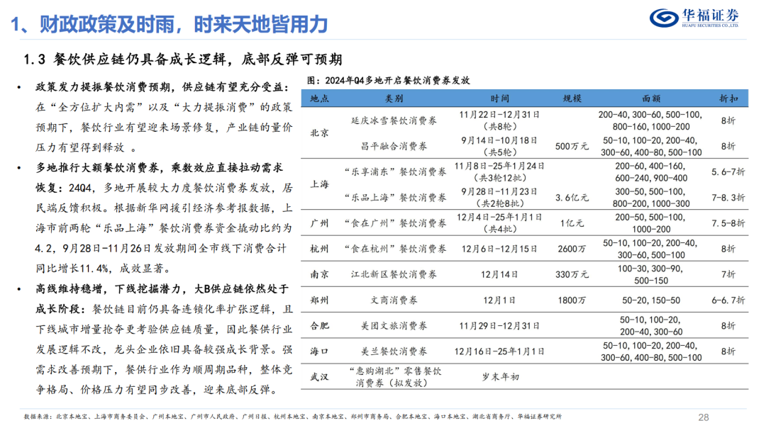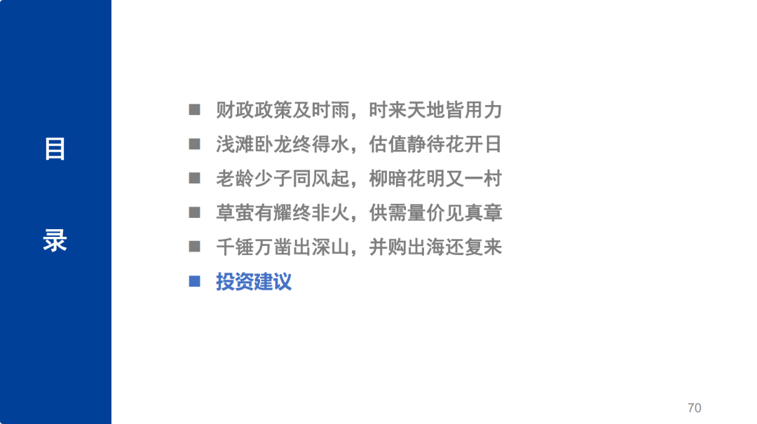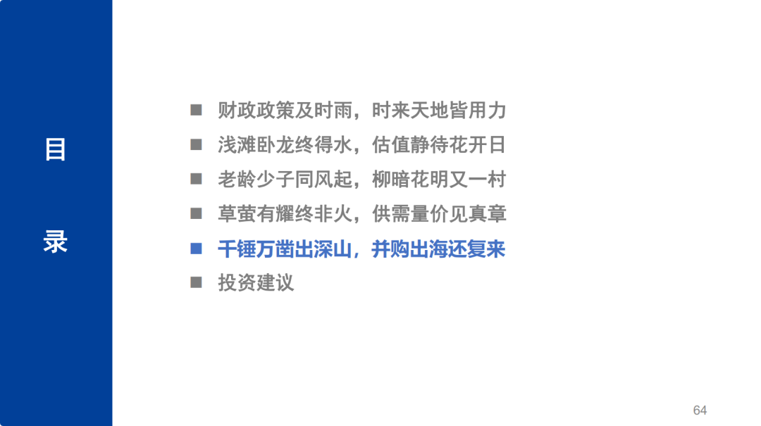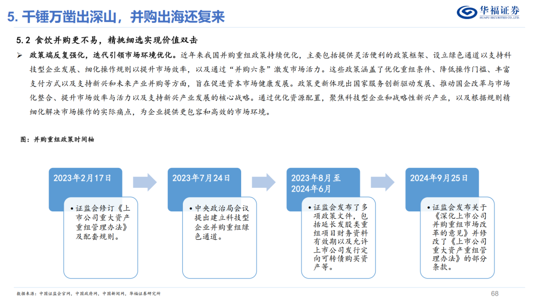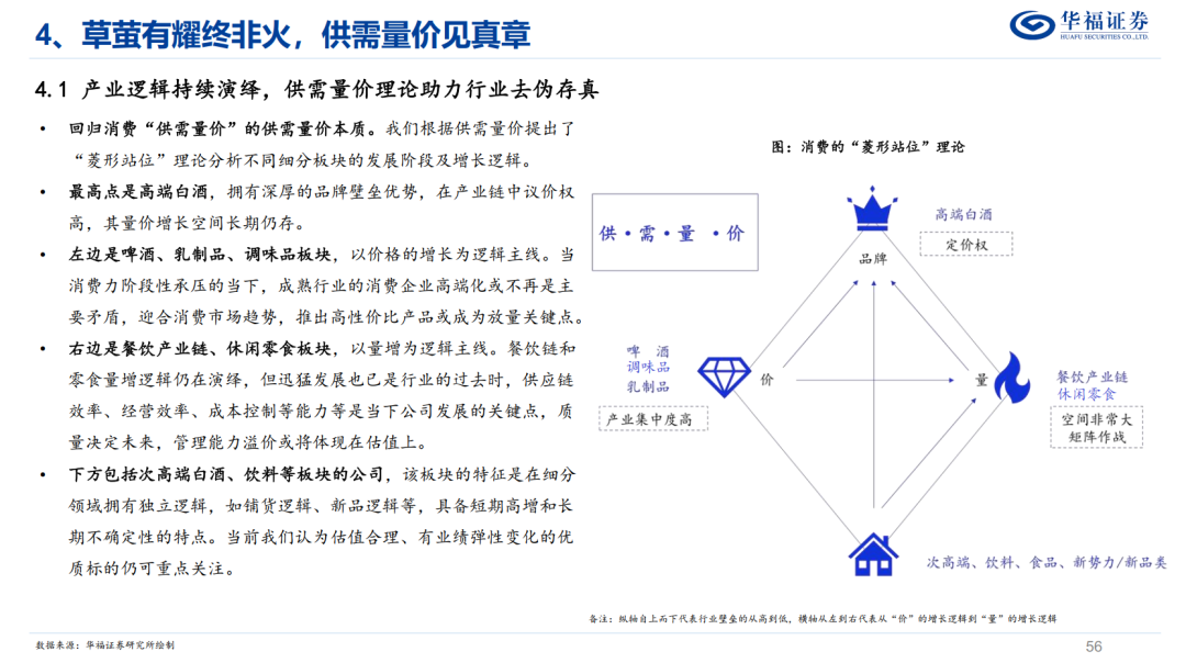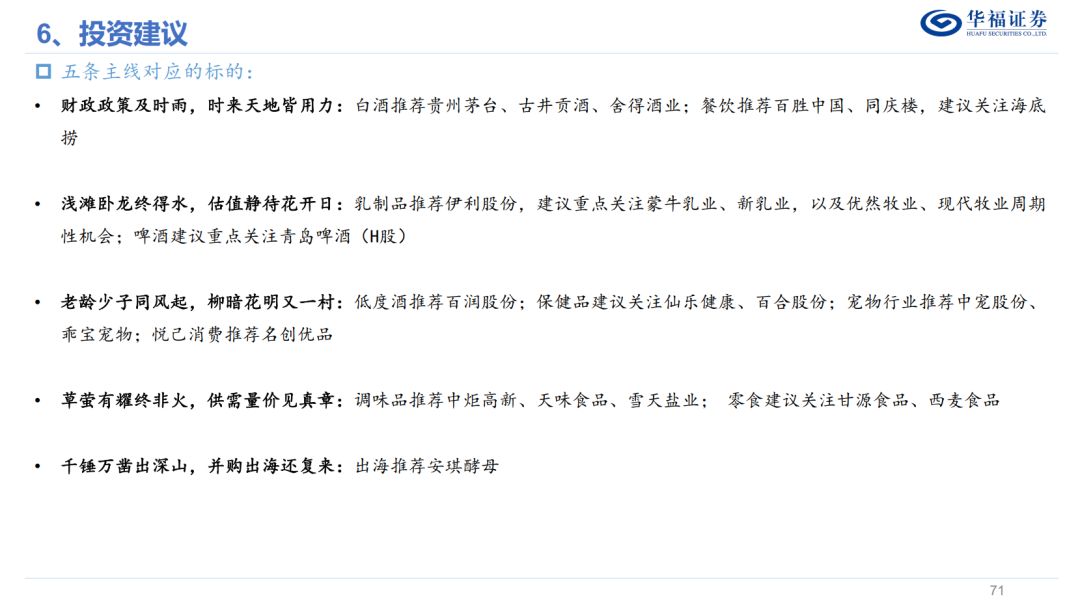 另外两条主线为,“草萤有耀终非火,供需量价见真章”,如饮料、调味品、零食,已经进入逻辑兑现阶段,需要有持续的业绩验证,行情方可持续,而预期较高下,边际变化超预期难度较大;“千锤万凿出深山,并购出海还复来”,并购及出海仍将是股价强催化,建议重点关注格局较为分散行业的头部企业并购意愿及动作,以及具备出海能力的产业链上游企业。