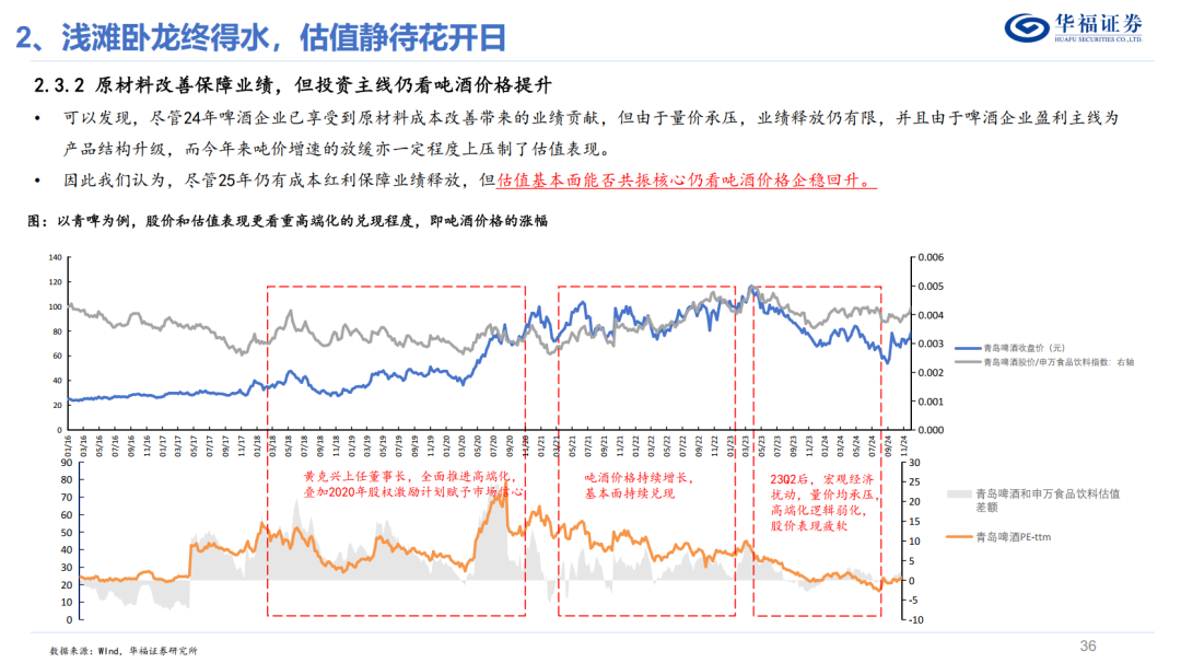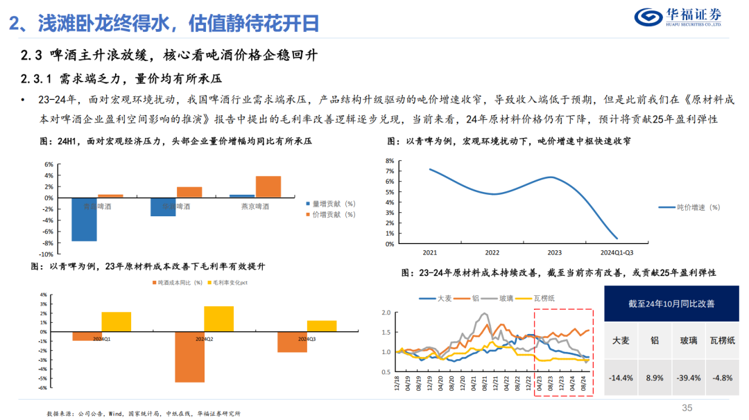 分析2024年的大众品板块的行情,市场更趋向短期逻辑兑现具备确定性的标的,特征为景气度高的赛道且业绩兑现,预计亦是由于市场对消费需求整体信心较弱、风险偏好较低的原因。我们认为,随着政策带来对内需信心的恢复,低估值板块有望迎来估值慢修复,“浅滩卧龙终得水,估值静待花开日”,估值分位数较低的主要为乳制品及啤酒板块,乳制品板块的上游牧场产能去化将带来乳企的盈利改善,啤酒吨酒价格企稳回升将均会成为其估值修复的核心要素。同时,市场仍将继续偏好高景气赛道标的,我们建议重点关注渗透率较低、具备发展潜力的赛道,“老龄少子同风起,柳暗花明又一村”,重点关注旅游、保健品、低度酒、洋酒。