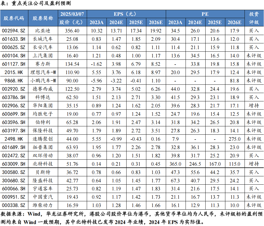 问界新M9/M8预售,鸿蒙智行开启新车周期,有望诞生多款爆款车型,维持行业“推荐”评级。个股方面,建议关注:(1)智驾领先整车标的比亚迪,长安汽车,长城汽车,上汽集团,赛力斯,理想汽车-W,小鹏汽车-W等;(2)智能化核心环节标的德赛西威,科博达,华阳集团,均胜电子,伯特利,保隆科技,速腾聚创,拓普集团,双环传动,北特科技,贝斯特,隆盛科技等;(3)商用车建议关注客车&重卡龙头宇通客车,中国重汽,潍柴动力等。